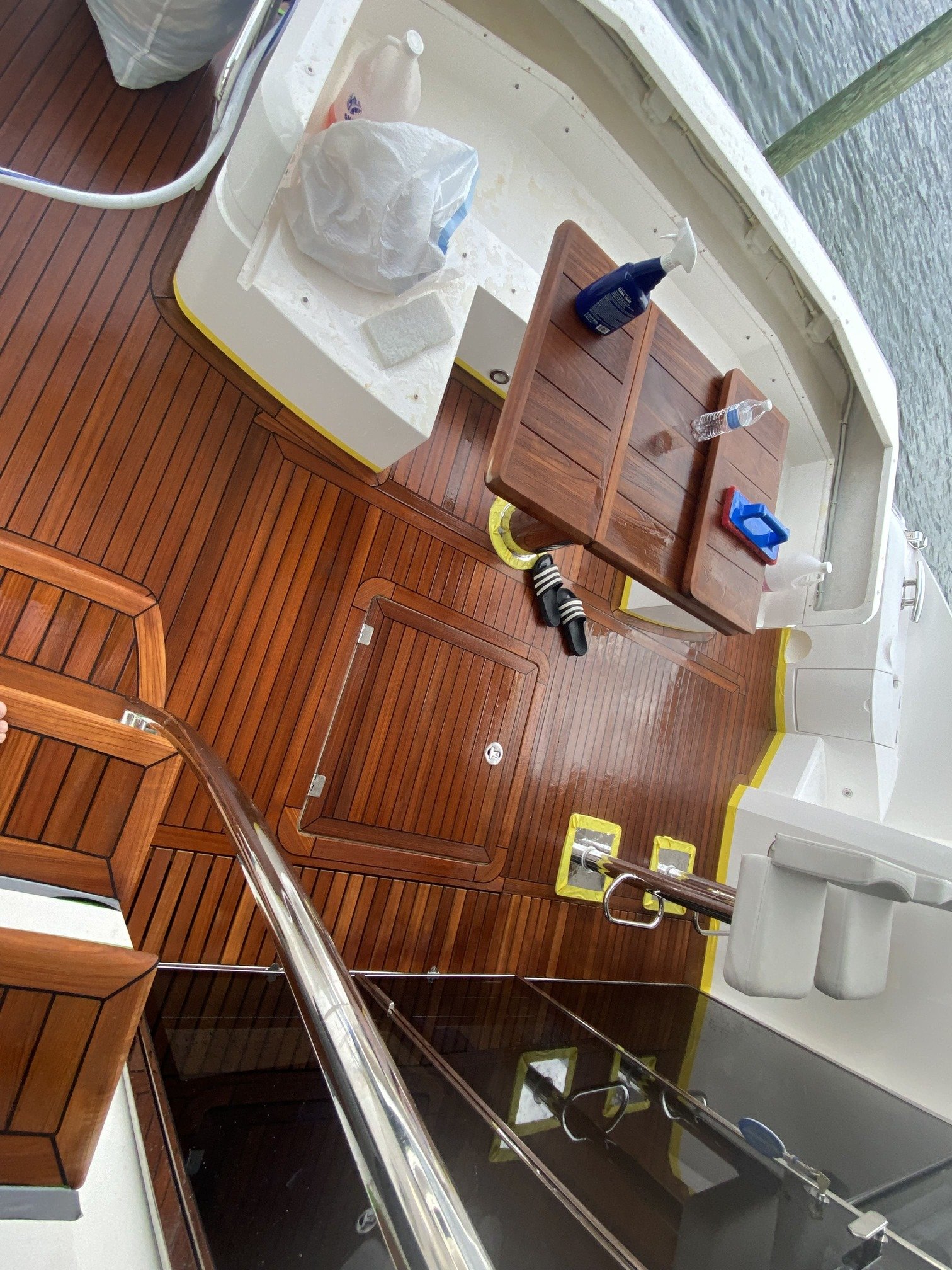 Exterior Care: Scheduled wash-downs, waxing and polishing, stainless and chrome polishing, teak deck cleaning and maintenance, and canvas/isinglass care.